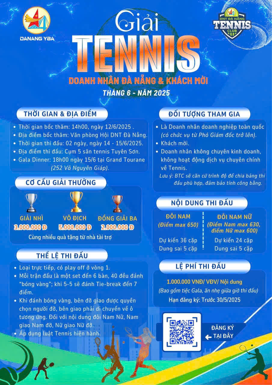 Chào mừng kỷ niệm 25 năm thành lập Hội Doanh nhân trẻ Đà Nẵng (2000–2025), CLB Tennis Doanh nhân - Hội DNT Đà Nẵng tổ chức “Giải Tennis Doanh nhân Đà Nẵng và Khách mời tháng 6, năm 2025”. Đây là giải đấu nhằm tạo sân chơi lành mạnh, nâng cao sức khỏe và thắt chặt mối quan hệ giao lưu, kết nối giữa cộng đồng Doanh nhân tại Đà Nẵng và các tỉnh thành.